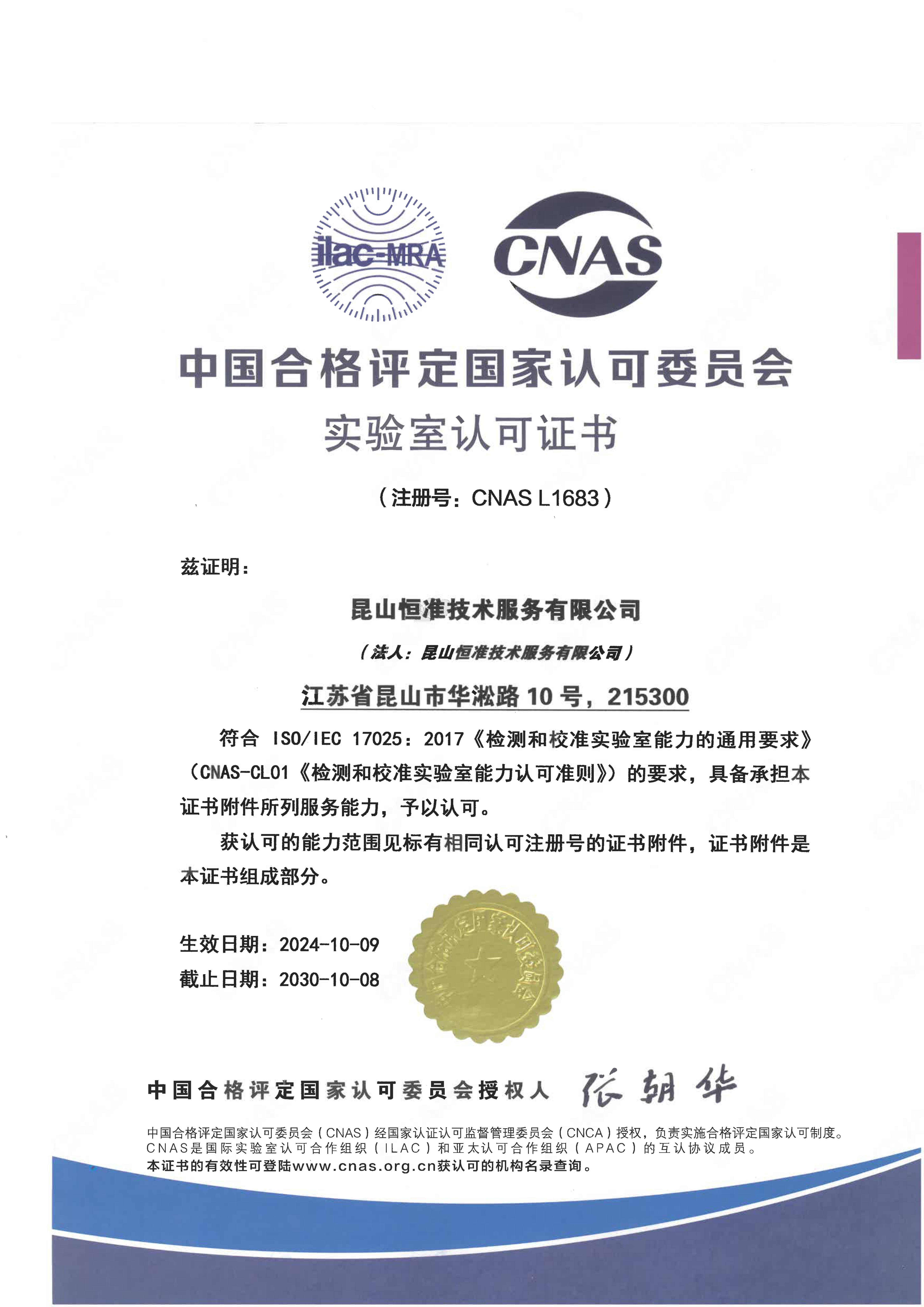" 昆山恒準(ETS),是具外資性質(zhì)校準實驗室中成立時間長、規(guī)模最大、最具影響力的專業(yè)第三方計量校準機構(gòu),出具的計量校準證書具有國際公信力. 一直潛心專注于精密儀器、設備的校準服務,執(zhí)著于『看不見的質(zhì)量』,堅持『勇于負責,確實做好每一次校準工作』的服務態(tài)度,讓客戶體驗真正負責任第三方實驗室的服務理念. 目前已經(jīng)獲得中國合格評定國家認可委員會(CNAS)認可項目300多項(NO.L1683),每年持續(xù)增加校準項目,提供客戶更全面服務,已累積獲得近萬家客戶的認可和大力支持.